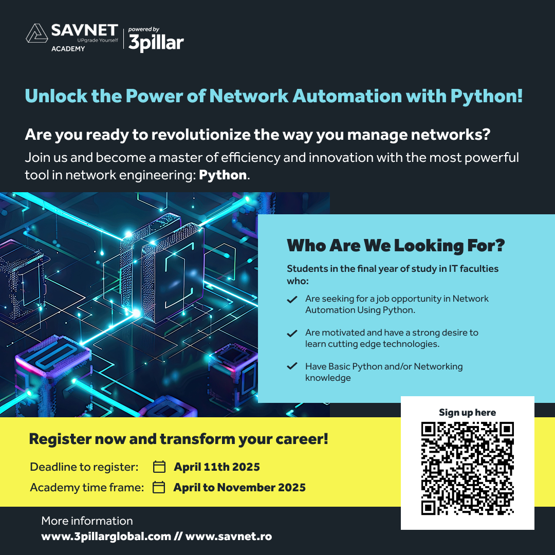 Studenților sau masteranzilor (ideal în an terminal și având cunoștinte de bază de retelistica si programare in Python sau orice alt limbaj de programare) de la Facultatea de Electronică și Telecomunicații, Facultatea de Automatică și Calculatoare sau Facultatea de Matematică-Informatică, dornici să învețe și să înceapă o carieră în lumea fascinantă a programarii.